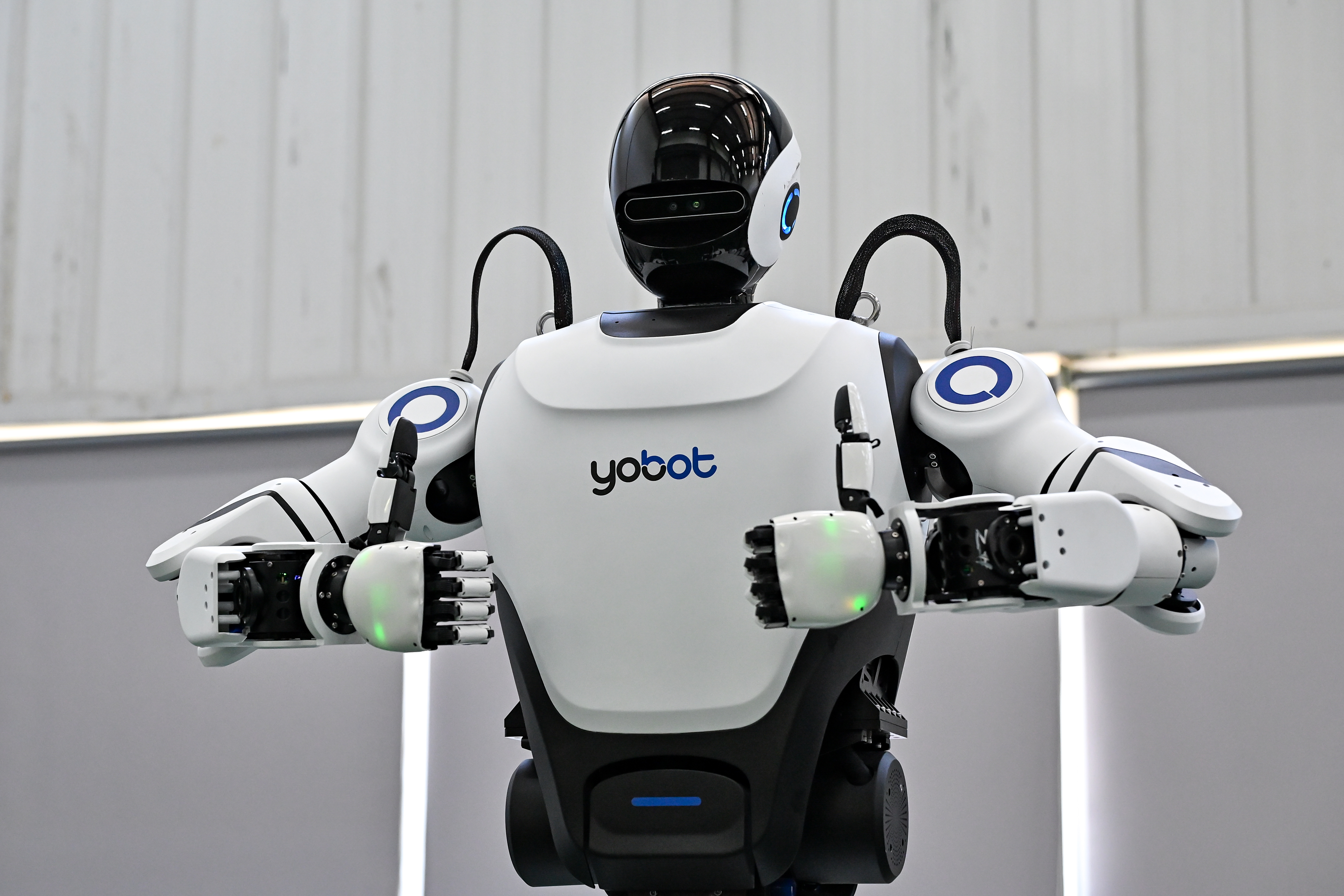 7月3日,在位于安徽省芜湖市的科技公司内,一款人形机器人在做手势。新华社记者 张铖 摄