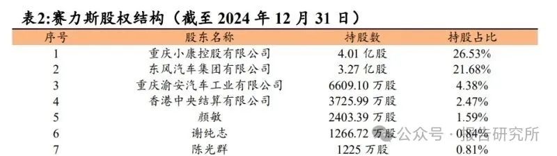 根据公司 2024 年的年报,赛力斯的实际控制人为张兴海,通过重庆小 康控股有限公司与重庆渝安汽车工业有限公司,持有赛力斯的股份。截至 2024 年 12 月 31 日,重庆小康控股有限公司持有赛力斯 26.53%的股份,东 风汽车集团有限公司持股比例为 21.68%,重庆渝安汽车工业有限公司的持 股比例为 4.38%。