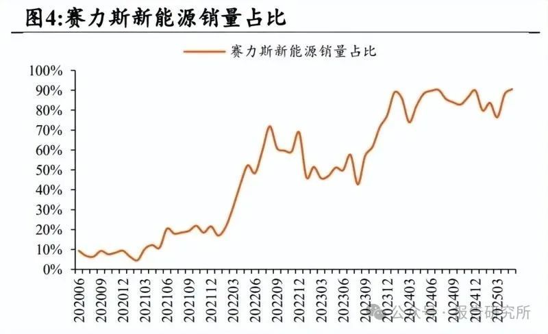 根据公司公告,2020 年 6 月至 2025 年 5 月,赛力斯的月度销量从 22002 辆增长至 44152 辆,新能源汽车销量占比从 9.33%增长至 90.56%。